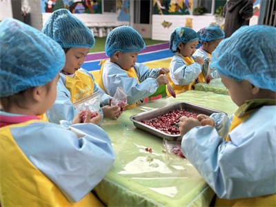 活动开始前,老师通过绘本故事向孩子们介绍石榴的生长环境、外形特征以及丰富的营养价值。随后,老师为孩子们分发了切开的石榴,手把手教大家如何轻轻剥开果皮,将里面的果粒小心翼翼地放进餐盘里。刚开始,有的孩子因为担心果粒掉落而有些紧张,在老师的鼓励和同伴的相互帮助下,他们渐渐掌握了技巧,小手指灵活地穿梭在石榴瓣之间,不一会儿,一个个餐盒就装满了红彤彤的果粒,像盛满了 “红宝石”。剥完果粒后,更有趣的 “手锤石榴” 环节来了!老师将孩子们剥好的果粒分到透明塑料袋中,再耐心示范如何轻轻捶打果粒:“小朋友们要像给小石榴按摩一样,慢慢捶,这样果汁才会跑出来哦!” 孩子们兴奋地单手慢慢捶打,看着果粒渐渐被捶出汁水,脸上满是成就感。