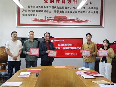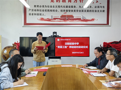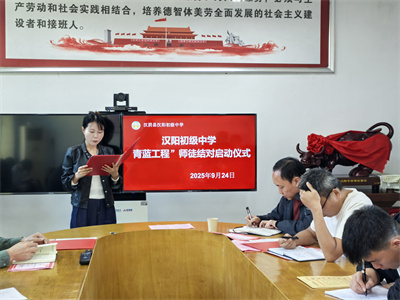 为持续加强教师队伍建设,助力青年教师成长。9月24日,汉阳初中举行了2025年秋季“青蓝工程”暨新学年度师徒结对启动仪式。全体教师齐聚一堂,共赴这场“师徒”传承之约 。