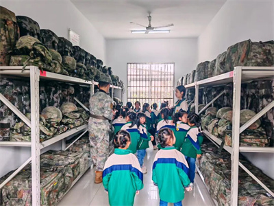 步入军史展览室,一张张珍贵的历史图片、一件件饱经沧桑的实物展陈,生动讲述着人民军队的光辉历程,孩子们触摸军械模型、聆听英雄故事,感受军人铁血担当的“硬核”精神,稚嫩的小脸上写满庄重与自豪。在内务展示环节,“豆腐块”被子、整齐划一的物品摆放令孩子们惊叹连连。