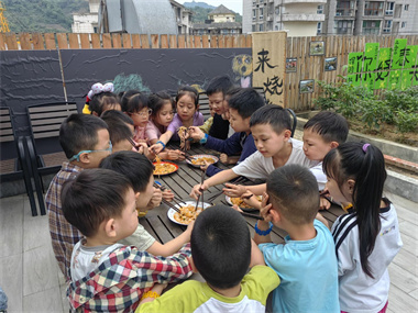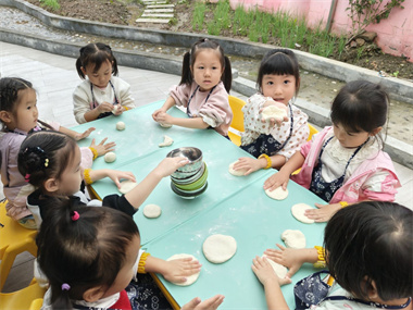 不同区域的游戏,为孩子们带来了多样化的技能提升与情感体验。体能类游戏帮助幼儿发展走、跑、跳、钻、爬等基本动作,为身体发育打下坚实基础;“烘焙坊”“小厨房” 等生活化活动,让孩子们在动手操作中提升创造力,无论是蛋挞、面包、月饼等西式糕点,还是安康蒸面、土豆丝夹馍、葱油饼等家乡美食,在这个过程中不仅锻炼了手部精细动作,孩子们的手艺更是不在话下;“户外美工”“编织扎染”“木工坊” 则成为激发想象力的天地,孩子们用树叶、石头创作画作,用毛线编织小挂饰,用小锤子、小锯子制作简单的木工作品,手部小肌肉群与手眼协调能力在实践中得到显著提高。