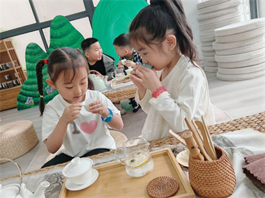 露台上,传统游戏和现代搭建更是玩出别样精彩:传统游戏区,孩子们一边玩着 “丢手绢”“老鹰捉小鸡”“踩高跷”的经典游戏,一边哼唱着经典儿歌,传统游戏的魅力用积木、木板搭建“文笔山”“北五省会馆”,将对生活的观察融入创作;功能部室里,“亲蚕”“茶艺” 等充满家乡特色的活动更是让孩子们沉浸式体验传统文化—— 在“亲蚕馆”,孩子们小心翼翼地给蚕宝宝换桑叶,观察它们从卵到蚕再到蛹的变化,学会尊重生命;在“茶艺室”,孩子们跟着老师学习温杯、泡茶,在慢节奏的操作中培养专注与耐心。