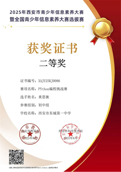 东城一中始终坚持 “科创育人” 理念、搭建系统化科创培养体系。回首过往这一年,东一学子可谓硕果累累、载誉而归!他们在第39届陕西省青少年科技创新大赛、中国国际大学生创新大赛(2025)萌芽赛道以及世界机器人大会青少年机器设计与信息素养大赛等诸多重量级赛事里大放异彩,斩获佳绩!在此,特向大家分享这份荣耀与喜悦!