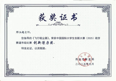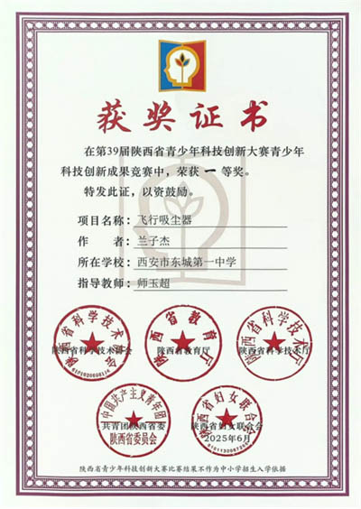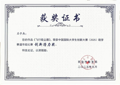 东城一中学生兰子杰的项目《飞行吸尘器》,在 “中国国际大学生创新大赛(2025)萌芽赛道省级赛” 中斩获第六名,且凭借该项目成功获得国赛推荐资格。