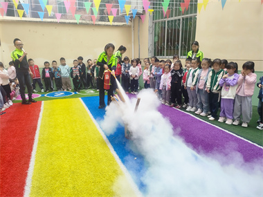 随后,幼儿园安全负责人向全体师幼现场演示了灭火器的使用方法,详细讲解“提、拔、握、压”四个关键步骤,并邀请教职工代表上台实操,进一步巩固消防技能。演练最后,负责人对本次演练进行总结,表扬了疏散过程中表现勇敢、有序的班级和幼儿,同时再次强调消防安全的重要性。