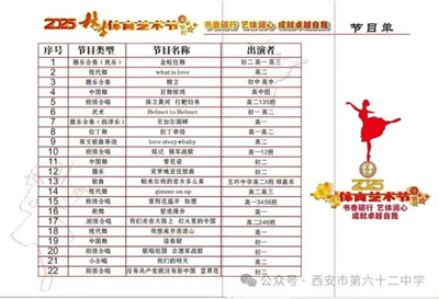作为西安市体育传统项目学校与体育传统特色学校,西安市第六十二中学始终深耕“国学教育、体育教育、劳动教育、艺术发展”领域,此次体育艺术节正是学校“体艺并举,促进学生全面发展”办学理念的生动实践。当夕阳为校园镀上金边,艺术的余韵仍在回荡——这场盛会不仅是一次才艺的展示,更是一次心灵的洗礼、一次成长的蜕变。未来,六十二中将继续以“书香”为魂、以“艺体”为翼,为学子们搭建更多成长舞台,让每一个生命都能在美与力量的滋养中,成长为卓越的自我。