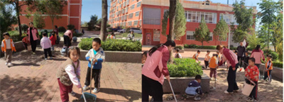 在晴朗的秋阳里,老师带领幼儿在园内,并走出园门为村子广场清理了卫生,优美了环境;老师们边清理边向幼儿讲解做文明活动、助人为乐的生动事例和意义,幼儿深受教育。