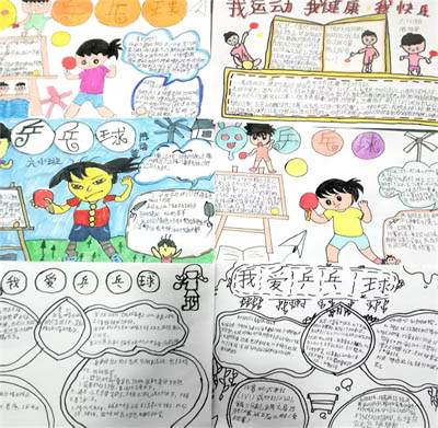 活动面向全体女生乒乓球社团队员,以女孩平时喜爱的周记、小作文、绘画、手抄报为主。按“乒乓球作文”、“乒乓球绘画”、“乒乓球手抄报”三个板块。孩子们围绕对乒乓球运动的认识、体会、感受以及校园乒乓故事等内容,创作出一幅幅“乒乓球文化”主题作品。
