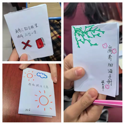 制作过程中,张老师穿梭在报告厅的座位之间,时而俯身查看同学们的书写,时而轻声给出建议:“把你最想实现的愿望写下来,它会成为你前行的动力;把能给你支持的人记下来,他们会是你最坚实的后盾。”同学们专注的神情、认真的姿态,构成了报告厅内最动人的画面。当手册制作完成,不少同学小心翼翼地将其对折,放进书包最里层,仿佛珍藏着一份珍贵的“备考宝藏”。