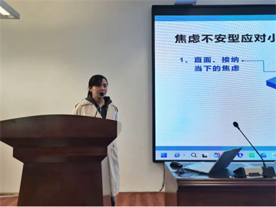 面对同学们普遍存在的焦虑情绪,张艳老师并未急于说教,而是在实验楼报告厅内引导大家开启一场沉浸式冥想疗愈。“请轻轻闭上眼睛,将注意力集中在自己的呼吸上,感受空气从鼻腔流入,带着一丝清凉,再从口腔缓缓呼出,带走心中的烦躁……”她温柔的声音透过音响在报告厅内缓缓流淌,同学们纷纷调整坐姿,双眼轻阖,眉头渐渐舒展,原本紧绷的身体慢慢放松,整个报告厅仿佛被一层宁静的氛围包裹。
