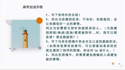 同学们拿起笔,笔尖在纸上沙沙作响,声音在安静的报告厅内格外清晰,仿佛在书写对未来的憧憬。有的同学在“目标”一栏郑重写下心仪大学的名字,字迹工整而坚定,眼神中满是向往;有的同学认真列出“听轻音乐”“去操场跑步”“和妈妈视频聊天”等解压方式,字里行间满是对自我情绪的关照;还有的同学在“鼓励的话”部分写道:“别怕暂时的困难,每一步努力都在靠近梦想”“你比自己想象中更坚强”,温暖的文字不仅是对自己的激励,更藏着对未来的信心。