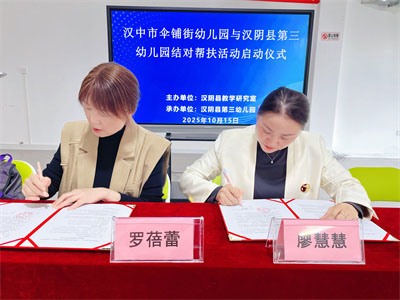 上午10:00,国培计划(2025年)薄弱幼儿园精准帮扶活动启动仪式在县第三幼儿园开展。仪式由汉阴县第三幼儿园办公室主任王灿主持。会上,汉阴县第三幼儿园园长廖慧慧发表了热情洋溢的讲话,并结合园所实际,坦诚分享了当前在师资队伍建设、课程实施等方面的需求,同时表达了对此次精准帮扶的期待,希望通过两园交流,为园所发展注入新动能。汉中市伞铺街幼儿园副园长罗蓓蕾明确了本次国培帮扶的具体计划,通过实地指导、专题培训等形式,精准解决汉阴县第三幼儿园的实际困惑。汉阴县教研室主任刘玉红从县域内学前教育发展的高度,强调了国培精准帮扶的重要意义,鼓励两园以此次活动为契机,建立长效合作机制,推动帮扶成果落地见效。最后,两园负责人共同签订了“一对一”国培精准帮扶协议书,明确了双方在师资培训、课程共建、管理交流等方面的合作内容。启动仪式结束后,汉中市伞铺街幼儿园帮扶团队开启了实地查看环节。从承载本土文化的人文汉阴馆、厚植爱国情怀的闪闪红星爱国馆,到培养幼儿科学素养的晨露科技馆、浸润书香的星月书屋,帮扶团队一路走、一路看、一路问,详细了解汉阴县第三幼儿园在环境创设、课程融合、特色活动开展等方面的实践情况,并结合自身经验,现场提出了针对性的优化建议,为后续精准培训奠定了基础。