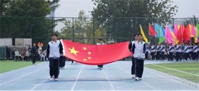 激昂的《运动员进行曲》响起,轻快的节奏声中,国旗方阵铿锵入场。鲜艳的五星红旗,代表着国运昌盛,寄托着青年的梦想。
